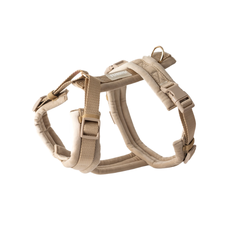 This harness is designed to give your dog the perfect fit, with the comfort they deserve. Thanks to the soft, breathable lining and four adjustment points, the harness fits snugly without restricting their movement. The Y-shape distributes pressure away from the neck, while the subtle gold hardware adds a touch of elegance to every walk.