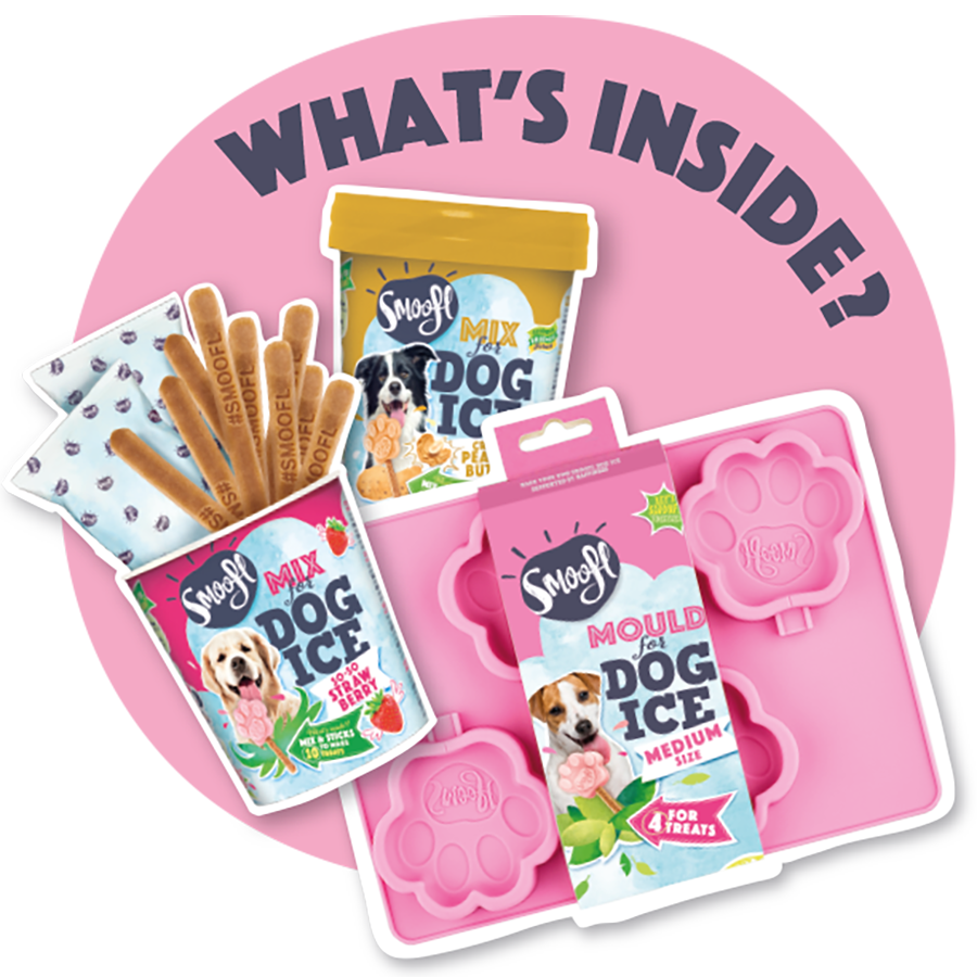 The kit includes Dog Ice Mix in Strawberry and Peanut Butter flavours, edible Joy Sticks and a Medium ice mould. What more could you want?