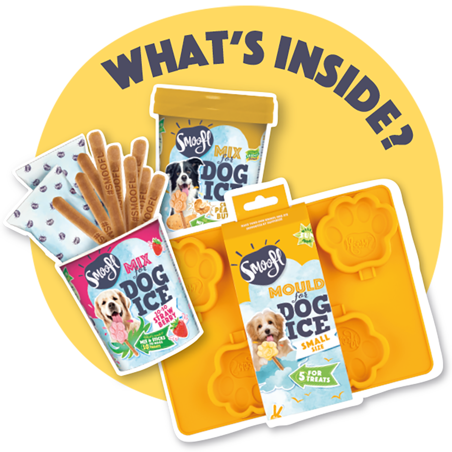 In the kit you will find the Dog Ice Mix in the flavors Strawberry and Peanut Butter, edible Joy Sticks and a Small ice mold. What more could you want?