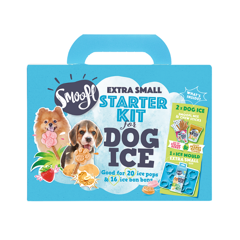 The kit contains Dog Ice Mix in Strawberry and Peanut Butter flavours, edible Chew Sticks and an Extra Small ice mould – everything you need to make your own dog ice cream.