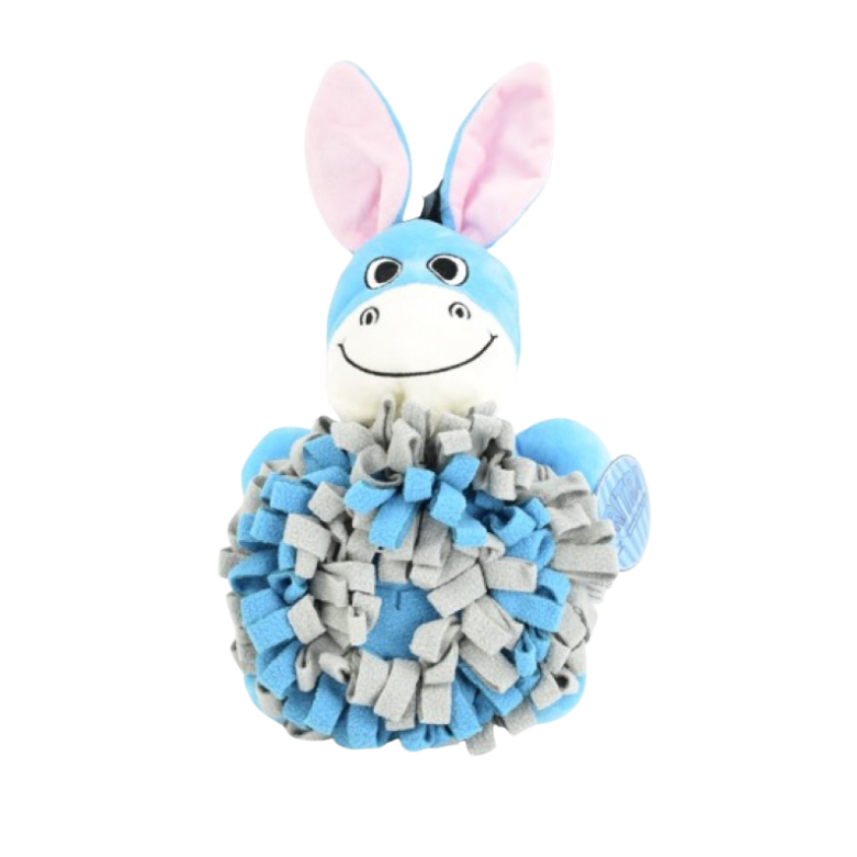 Leuke knuffel - snuffelmat (25-30cm groot) ineen voor de grote en kleine hond. In zijn buik (met pieper) zit een kleine uitsparing voor een heerlijke lekkernij en rondom in en tussen de lussen is er ruimte om brokjes te verstoppen. Uw hond of pup kan zich heerlijk vermaken met de snuffelmat en daarna heerlijk in slaap vallen met zijn of haar lievelingsknuffel.