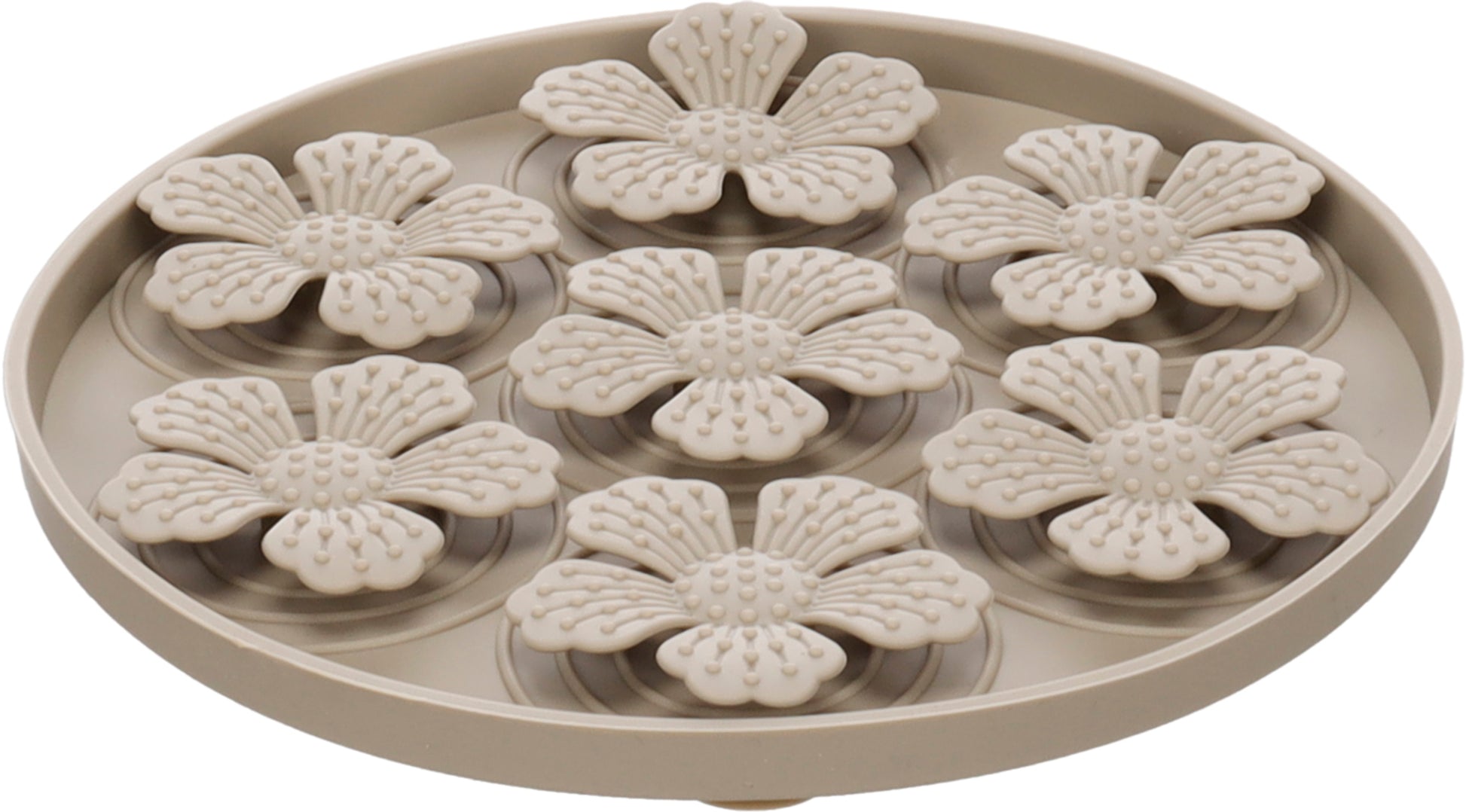 Geef je harige vriend een smakelijke uitdaging met deze likmat Fleur in taupe! Perfect voor zowel honden als katten; ook de kleinste vriendjes kunnen smullen. Met stevige zuignappen blijft hij op z'n plek, of je nu natvoer of smeerpasta serveert. Makkelijk schoon te maken in de vaatwasser en bestand tegen de vriezer. Ideaal om schrokken te voorkomen en je huisdier lekker bezig te houden!