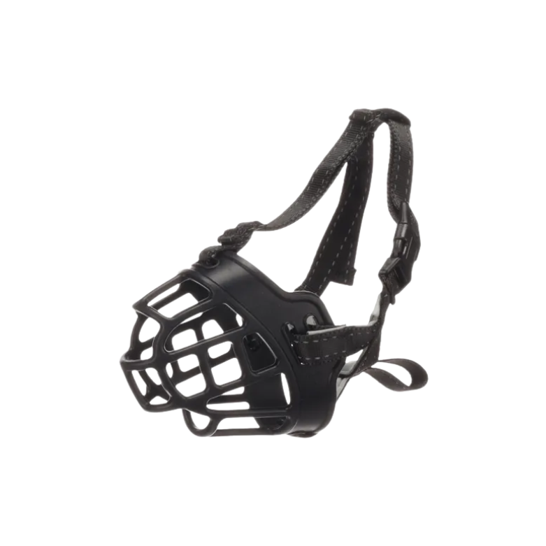 - Door de openingen in de muilkorf kan de hond nog drinken en snacks aannemen