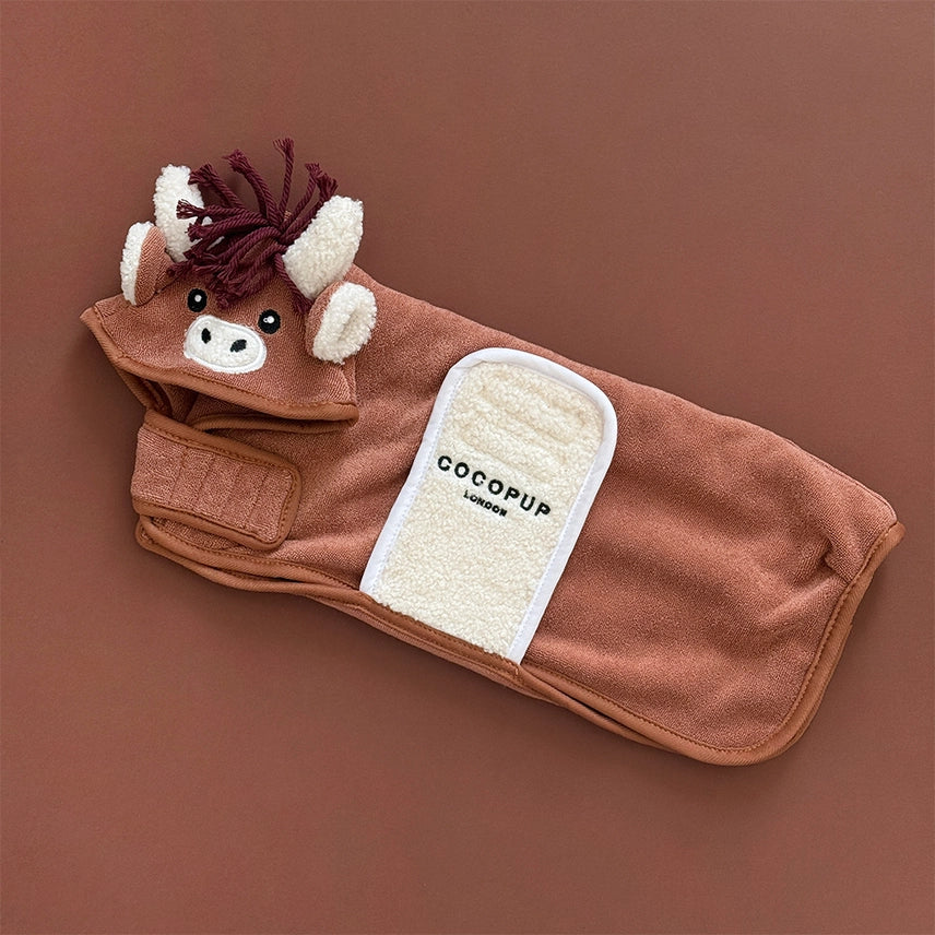 Onze Koe Drying Robe is de leukste manier om je af te drogen na een goede duik! Zorg ervoor dat je pup er tegelijkertijd schattig en droog uitziet met deze stijlvolle en gezellige badjas voor teddyhonden. Steek je hond gewoon in onze badjas en maak hem vast om de buik en nek met onze supereenvoudige klittenbandpatches. Perfect om te ontspannen na een walkie... zeg vaarwel tegen de geur van natte honden en eindeloos wrijven!