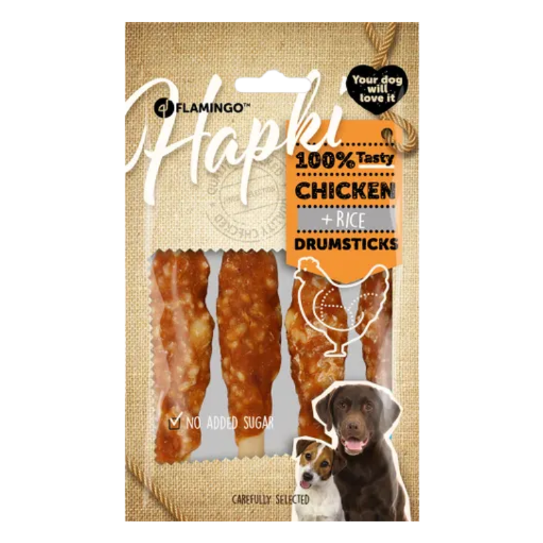 Verwen je trouwe viervoeter met deze smakelijke Hapki-drumsticks! Gemaakt van kip en rijst, zonder toegevoegde suikers. Perfect voor een gezonde snackpauze. Laat je hond genieten van een knapperige traktatie!