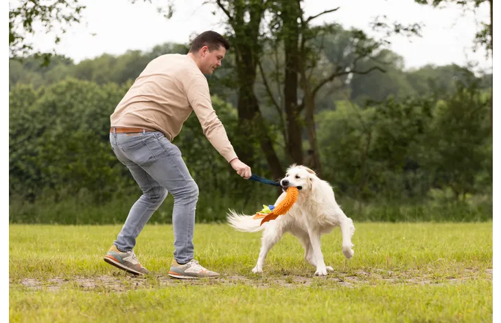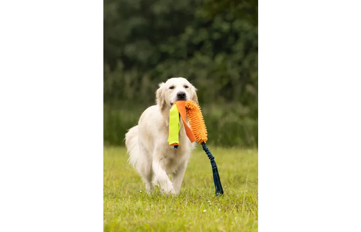Dit te gekke trektouw Fauxtra is dé must-have voor jouw harige vriend! Gemaakt van nylon en polyester met eenvoudig ontwerp – ideaal voor apporteerspelletjes. Afgewerkt met chenille en fleece voor extra knuffelbaarheid. Het elastische handvat maakt spelen super leuk en de lintjes zorgen voor extra speelplezier. Laat het speelfestijn maar beginnen!