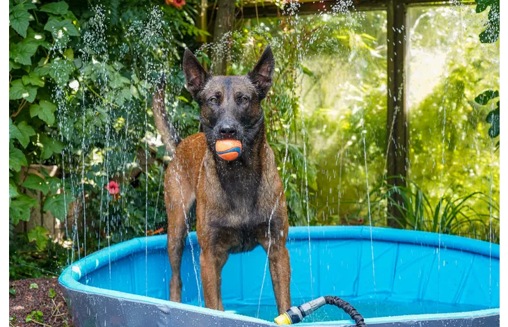 Dit coole zwembadje is gemaakt van stevig kunststof en heeft een antislip binnenkant. Met de afsluitbare stop en dop sluit je 'm makkelijk aan op de waterslang. De rand spuit waterstralen en je hebt geen luchtpomp nodig. Inclusief herstellingspatch.